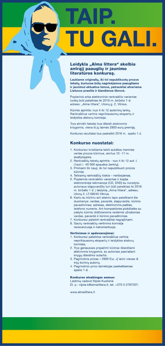 Leidykla „Alma littera“ paskelbė antrąjį „Paauglių ir jaunimo literatūros konkursą“. Leidykla laukia originalių, iki tol nepublikuotų prozos tekstų, kuriuose būtų nagrinėjamos paaugliams ir jaunimui aktualios temos, patraukliai atveriama Lietuvos praeitis ir šiandienos tikrovė.