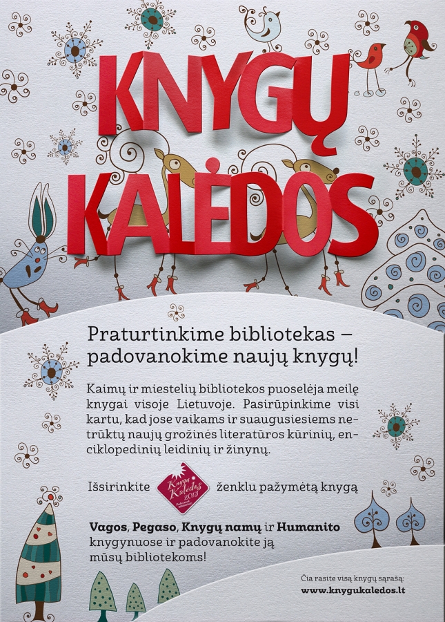 Daugiau nei 1000 kaimų ir miestelių bibliotekų parengė reikalingiausių knygų sąrašą. Lapkričio 19 – sausio 6 dienomis knygynuose „Vaga“, „Pegasas“, „Knygų namai“ ir „Humanitas“ įsikurs specialios „Knygų Kalėdų“ lentynos. Akcijoje dalyvaujančios knygos bus pažymėtos lipduku ir joms bus taikoma 20 proc. nuolaida.