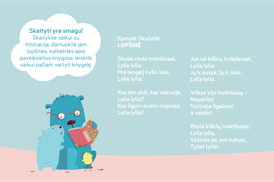 Kam vaikui reikalinga kalba? Tam, kad jis galėtų ne tik pats suprasti jį supantį pasaulį, bet ir išsakyti tai, kas jam yra svarbu. Elementariausia prasme – kad jis taptų raštingas, kad galėtų atpažinti tam tikrus ženklus, gebėti išsiaiškinti įvairias situacijas. Tačiau lygiai taip pat knyga yra didžiulis malonumas. Ji gali suteikti pačias geriausias emocijas kiekvienam skaitytojui – ji gali būti ir atostogos, ir nuotykiai, ir net pabėgimas nuo kasdienos. Teiginys, jog skaityti galima nuo pirmųjų dienų, o galima ir tada, kol mama laukiasi, dažnai sutinkamas su nuostaba. Tėvams kyla ir kitas klausimas – ką skaityti tokiam mažam vaikui, kuris net nesupras, kas jam skaitoma? Kūdikystė – puikus metas lopšinėms, čiūčiavimams, išraiškingai skaitomoms ir net suvaidinamoms trumpoms pasakaitėms. Tačiau ir knygučių, tinkamų kūdikiui, kuris jau ima žaislus į rankas pats, galima įsigyti. Minkštos, kramtomos, įvairios tekstūros, aiškiais paveiksliukais. Galbūt skaitymu tokį procesą sunku pavadinti, bet net ir tokius puslapius versdamas, uosdamas ar ragaudamas vaikas susipažins su knyga ir žinos, kad joje galima rasti pačių įdomiausių dalykų.