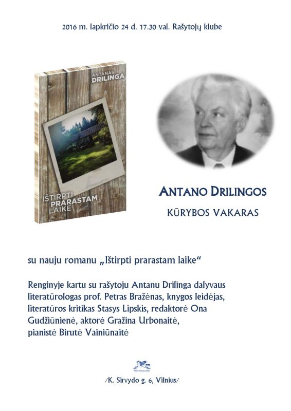 Lapkričio 24 d. 17.30 val. Rašytojų klube rašytojo Antano Drilingos kūrybos vakaras su nauju romanu „Ištirpti paprastam laike“. Renginyje dalyvaus knygos autorius Antanas Drilinga, literatūrologas prof. Petras Bražėnas, knygos leidėjas Stasys Lipskis, redaktorė Ona Gudžiūnienė, aktorė Gražina Urbonaitė, pianistė Birutė Vainiūnaitė.