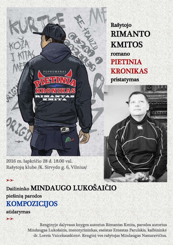 Lapkričio 28 d. 17.30 val. Rašytojų klube rašytojo Rimanto Kmitos romano „Pietinia kronikas“ pristatymas. Dailininko Mindaugo Lukošaičio piešinių parodos „Kompozicijos“ atidarymas. Renginyje dalyvaus knygos autorius Rimantas Kmita, parodos autorius Mindaugas Lukošaitis, menotyrininkas, eseistas Ernestas Parulskis, kalbininkė dr. Loreta Vaicekauskienė. Renginio vedėjas – rašytojas Mindaugas Nastaravičius.