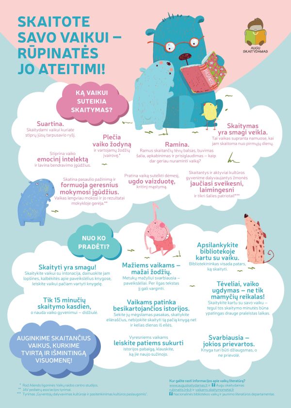 Prisidėkime visi prie daugiau skaitančios tautos. Jeigu pritariate ir jums tai atrodo prasminga, savaitę iki balandžio 23 d. atsispausdinkite šį plakatą ir pakabinkite jį patogioje vietoje, kur lankosi tėvai – darželiuose, mokyklose, savo namų laiptinėse, biuruose, poliklinikose. Dalykitės žinia apie skaitymo naudą, kad kuo daugiau tėvų galėtų perskaityti apie skaitymo svarbą ir gauti patarimų. Plakate yra nuorodos į interneto svetaines auguskaitydamas.lt bei rubinaitis.lnb.lt, kurioms informaciją rengia geriausi šalies vaikų literatūros specialistai.