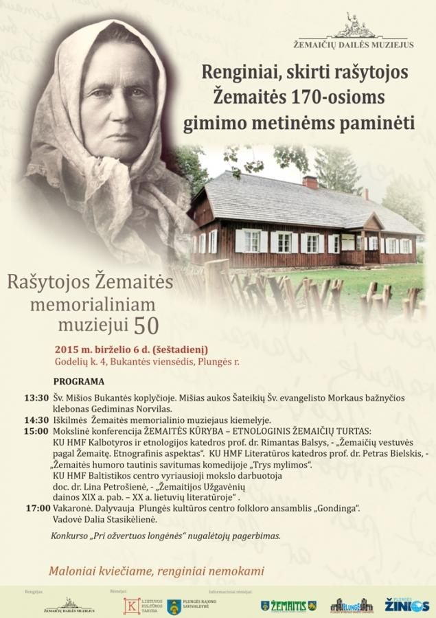 Iškilmės numatytos birželio 6 dieną (šeštadienį), todėl visus po pamaldų Bukantės koplyčioje kviečiame jaukiai įsikurti Žemaitės memorialinio muziejaus kiemelyje, kuriame Jūsų laukia daug įdomių faktų apie rašytojos Žemaitės kūrybą atskleidžianti programa. Mokslinėje konferencijoje „Žemaitės kūryba – etnologinis žemaičių turtas“ bus nauju aspektu pažvelgta į Žemaitės kūrybą. Prof. dr. Rimanto Balsio pranešimo „Žemaičių vestuvės pagal Žemaitę“ anonse rašoma: „XX a. etnografų ir etnologų darbuose tradicinė lietuvių šeima, vedybų, krikštynų ir kiti šeimos papročiai dažniausiai gana stipriai romantizuoti. Teigiama, kad tradicinėje šeimoje vyravo meilė, pagarba, švelnumas, rūpestingas vaikų auklėjimas. Tam skirti ir turtingi, turiningi, prasmingos simbolikos kupini vestuvių, krikštynų papročiai. Visiškai kitaip tradicinio laikotarpio šeimą, joje dominuojančius santykius, papročius mato ir vaizduoja Žemaitė“... Prof. dr. Petras Bielskis pranešime „Žemaitės humoro tautinis savitumas komedijoje „Trys mylimos“ atskleis, kaip tarybiniais metais, griežtos cenzūros sąlygomis, kolūkių steigimo ir tremčių įkarštyje Lietuvos teatre pagal Žemaitės kūrinį buvo pastatytas antitarybinis spektaklis. Kaip tatai galėjo įvykti? Doc. dr. Linos Laurinavičiūtės-Petrošienės pranešime „Žemaitijos Užgavėnių dainos XIX a. – XX a. pr. lietuvių literatūroje“ sakoma, kad „Žemaitijoje per Užgavėnes persirengėlių „ubagų“, „žydų“, „čigonų“ dainuotas dainas, kurias ir patys dainininkai, ir folkloro rinkėjai dažniausiai laiko „nerimtomis“, XIX a. – XX a. pr. lietuvių literatūros pirmeiviai, tarp jų ir J. Žemaitė, naudojo savo kūryboje. Literatūros kūriniuose įkomponuotos etnografinės detalės, personažų charakteriai ir net ištisi dainų tekstai atskleidė tuometinio gyvenimo epizodus, juos apsaugojo nuo prapulties. Minėtosios dainos ilgainiui įgavo ir dar vis įgauna naują įprasminimą, kuris neribotam laikui pratęsia jų būtį“. Koks dvarelis be vaišių, be dainų ir dar tokia proga? Klausysimės Plungės kultūros centro folkloro ansamblio „Gondinga“ (vadovė Dalia Stasikėlienė) nuotaikingos programos, o kad nepritrūktų ruodas, ragausime žemaitiškas pastruovas, tiesa, tik šio muziejaus moterų rankų paruoštas. Ir tik vėlai vakare, saulelės akelėms merkiantis pro medžių šakas, paliksime Žemaitės tėviškę...