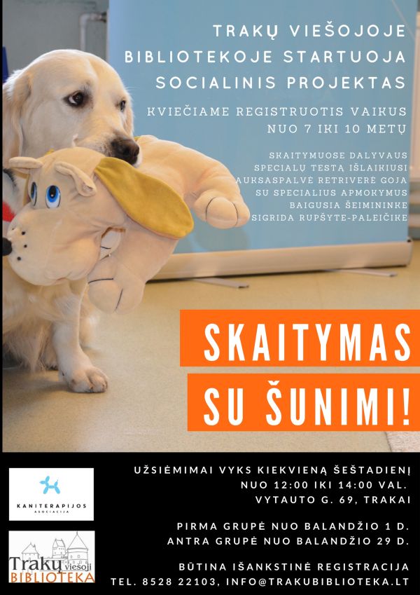 Šį pavasarį, tęsiant bendradarbiavimą su Kaniterapijos asociacija, pradedamas antrasis skaitymų su šunimi etapas, kuris vyks balandžio–gegužės mėnesiais kiekvieną šeštadienį Trakų viešojoje bibliotekoje. Pirmoji grupė skaitymus pradės balandžio 1 d., antroji – balandžio 29 d.