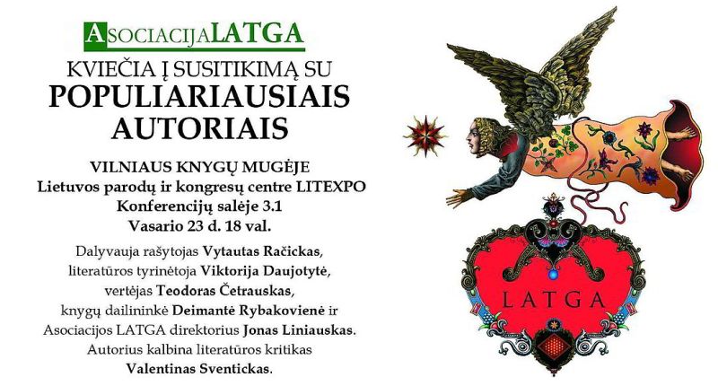 Vasario 23-26 d. parodų centre „Litexpo“ vykstančioje 18-ojoje Vilniaus knygų mugėje antrą kartą dalyvaus Asociacija LATGA. Trečiojoje salėje esančiame stende mugės lankytojus bei dalyvius asociacijos specialistai kvies konsultuotis, bendrauti ir bendradarbiauti visas keturias dienas nuo ryto iki vakaro. O jau pirmąją mugės dieną, t. y. vasario 23 d., Konferencijų salėje 3.1. vyks susitikimas su bibliotekų lankytojų mėgstamiausiais autoriais, kurį ves literatūros kritikas Valentinas Sventickas.