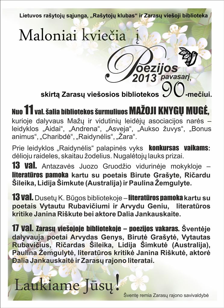 Ketvirtadienį, gegužės 23 d., šalia bibliotekos nutūps gausus poezijos paukščių ir leidyklų būrys. Nuo 11 valandos šalia bibliotekos šurmuliuos mažoji knygų mugė, o skaitykloje vyks tradicinis „Poezijos pavasaris 2013“.