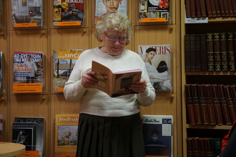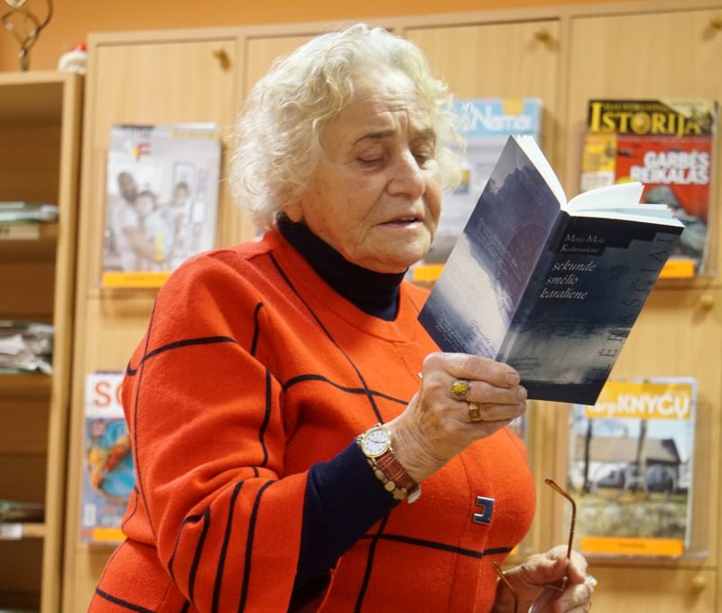 Šis rudeninis vakaras – puikus laikas poezijai... Tiesa, poezija į jos gyvenimą atėjo, rodos, atsitiktinai. Pirmas eilėraštis tiesiog, anot jos, iššoko važiuojant dviračiu į Jaskoniškes. Užsirašinėjant į užrašų knygelę, ji greit pildėsi... Šiandien jos poetinėje sąskaitoje – nemaža krūva poezijos knygelių. Nuoširdžius eilėraščius, verčiančius susimąstyti, pažvelgti giliau, poetė raiškiai skaitė, deklamavo. „Tebūna skaidru už savo viešnagę dėkot,“ – nuoširdžiai sakė M. M. Kudarauskaitė, baigdama kalbėti apie poeziją ir toliau tęsė, kaip gimė mintis parašyti prozos knygą „Istorija iš pastalės“. Paskui pasakojo apie tai, kaip studijuodama pateko į dramos studiją. Žavėjomės ne tik nuostabiu pasakojimu, vaizdžia gyva kalba, bet ir subtiliu humoro jausmu ir tyra išmintimi, todėl laikas tikrai neprailgo.