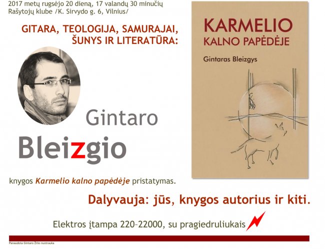 Susitikimas su rašytoju Gintaru Bleizgiu ir jo naujojo romano „Karmelio kalno papėdėje“ pristatymas. Renginys iš ciklo „Atradimai: knyga ir rašytojas“.