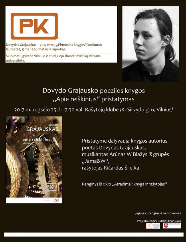 2017 metų „Pirmosios knygos“ konkurso laureato Dovydo Grajausko poezijos knygos „Apie reiškinius“ pristatymas.