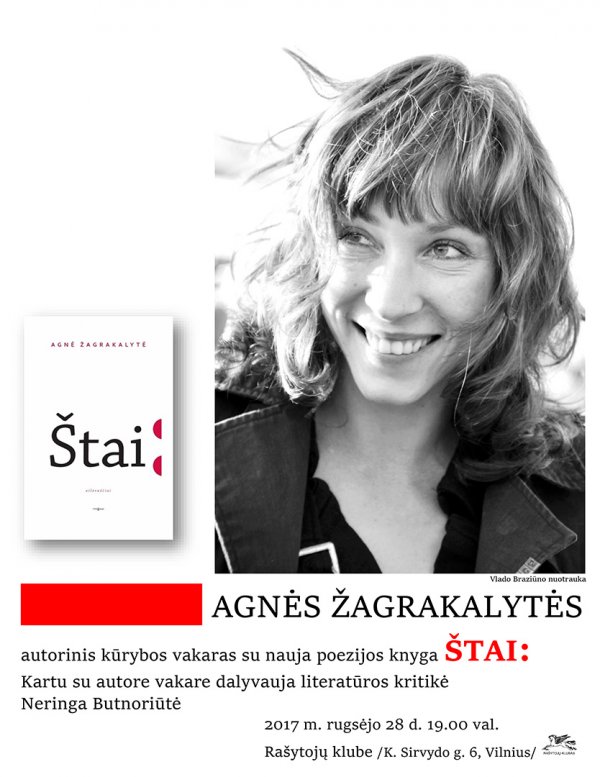 Rašytojos Agnės Žagrakalytės autorinis kūrybos vakaras su nauja poezijos knyga „Štai:“. Kartu su autore vakare dalyvauja literatūros kritikė Neringa Butnoriūtė. Renginys iš ciklo „Atradimai: knyga ir rašytojas“.