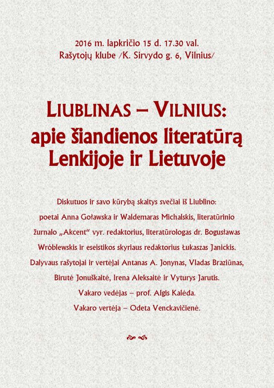Lapkričio 15 d. 17.30 val. „Liublinas – Vilnius“: apie šiandienos literatūrą Lenkijoje ir Lietuvoje. Diskutuos ir savo kūrybą skaitys svečiai iš Liublino: poetai Anna Goławska ir Waldemaras Michalskis, literatūrinio žurnalo „Akcent“ vyr. redaktorius, literatūrologas dr. Bogusławas Wróblewskis ir eseistikos skyriaus redaktorius Łukaszas Janickis. Dalyvaus rašytojai ir vertėjai Antanas A. Jonynas, Vladas Braziūnas, Birutė Jonuškaitė, Irena Aleksaitė ir Vyturys Jarutis. Vakaro vedėjas – prof. Algis Kalėda. Vakaro vertėja – Odeta Venckavičienė.