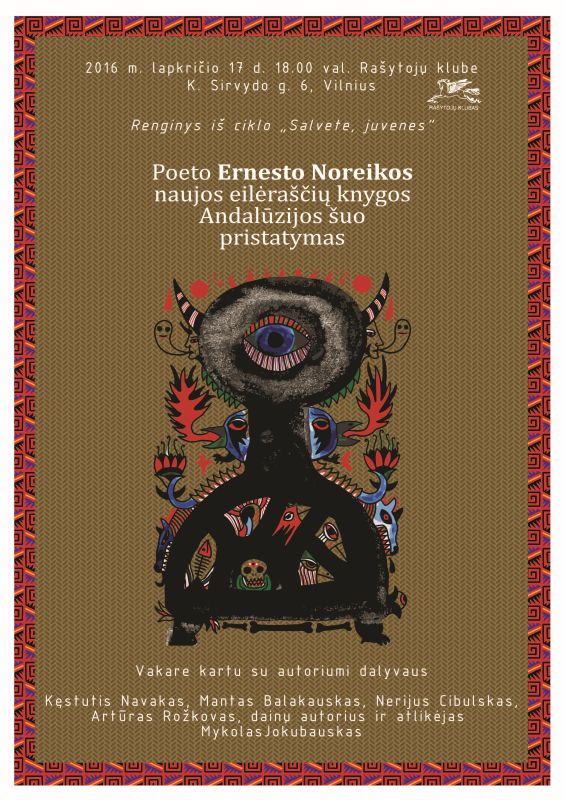 Lapkričio 17 d. 18.00 val. Rašytojų klube renginys iš ciklo „Salvete, juvenes“. Poeto Ernesto Noreikos naujos knygos „Andalūzijos šuo“ pristatymas. Renginyje dalyvaus Kęstutis Navakas, Mantas Balakauskas, Nerijus Cibulskas, Artūras Rožkovas, dainų autorius ir atlikėjas Mykolas Jokubauskas.
