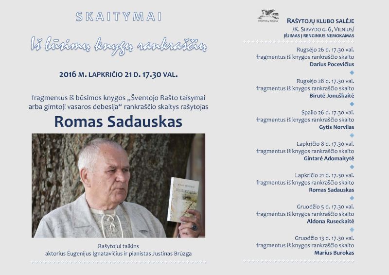 Lapkričio 21 d. 17.30 val. Rašytojų klube skaitymai iš ciklo „Iš būsimų knygų rankraščių“. Fragmentus iš būsimos knygos „Šventojo Rašto taisymai arba gimtoji vasaros debesija“ skaitys rašytojas Romas Sadauskas. Autoriui talkins aktorius Eugenijus Ignatavičius ir pianistas Justinas Brūzga.