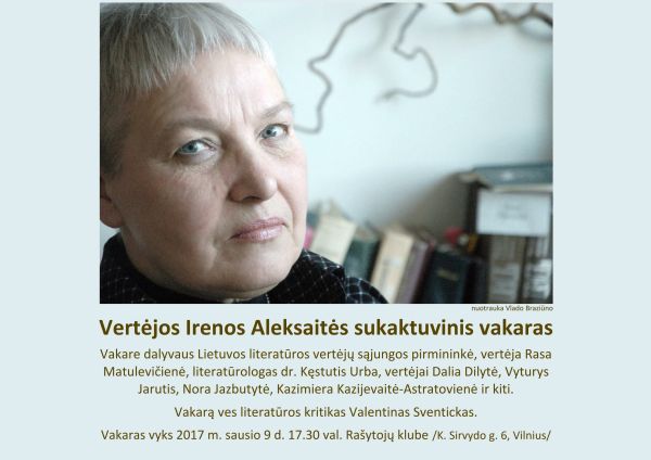 Sausio 9 d. 17.30 val. Rašytojų klube vertėjos Irenos Aleksaitės sukaktuvinis vakaras (65 m.). Vakarą ves literatūros kritikas Valentinas Sventickas. Dalyvaus Lietuvos literatūros vertėjų sąjungos pirmininkė, vertėja Rasa Matulevičienė, literatūrologas dr. Kęstutis Urba, vertėjai Dalia Dilytė, Vyturys Jarutis, Nora Jazbutytė, Kazimiera Kazijevaitė-Astratovienė ir kiti.