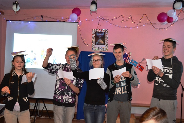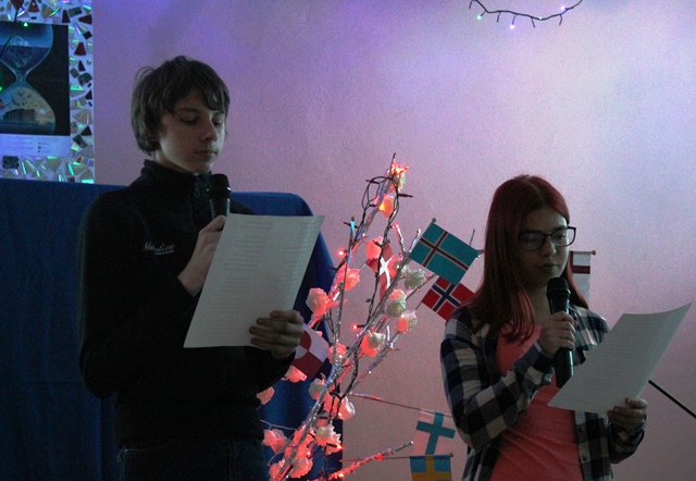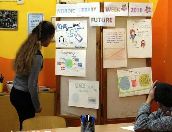 Lapkričio 24 d. anglų kalbos mokytoja D. Pūkienė ir dailės mokytoja Audronė Užtupienė pakvietė 8–9 klasių mokinius į integruotą pamoką. Anglų kalbos mokytoja demonstravo nuotraukas iš Šiaurės šalių bibliotekų savaitės renginių mokykloje. Mokiniai anglų kalba vardijo jiems labiausiai patikusius: dainas, laiškus ateičiai, geografijos pamoką, būrėjos paslaugas, knygų inscenizacijas, skandinaviškus patiekalus, meninių kompozicijų kūrimą nišose. Dailės mokytoja priminė, kad plakatas turi būti matomas iš didelio atstumo, lengvai suprantamas žiūrovams, teksto turi būti nedaug. Po dviejų pamokų darbo grupių lyderiai pristatė savo plakatus. Visų grupių darbus susegę į vieną vietą, mokiniai sukūrė puikų įspūdžių iš Šiaurės bibliotekų savaitės apžvalgos stendą. Jis puoš mokyklą, primindamas nepaprastą šiaurietiškos kultūros pažinimo savaitę.